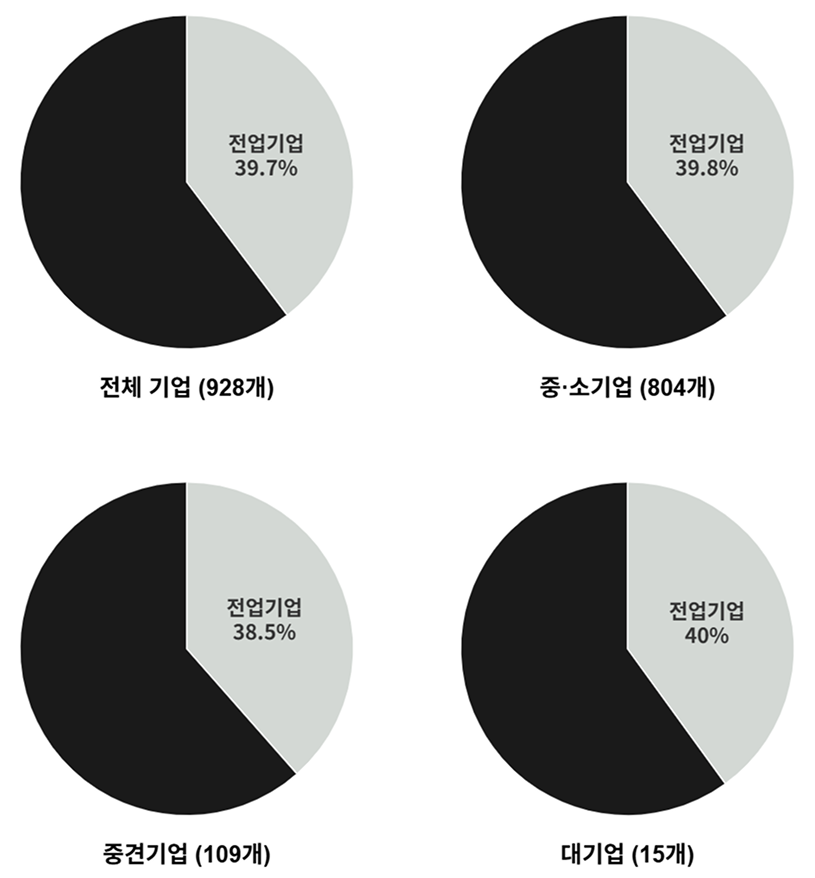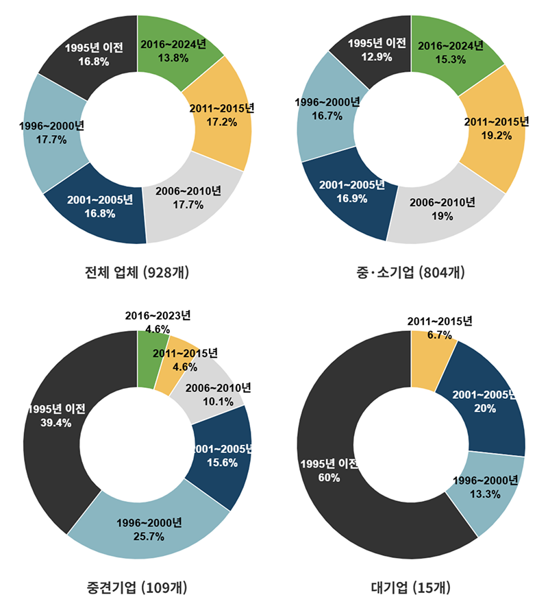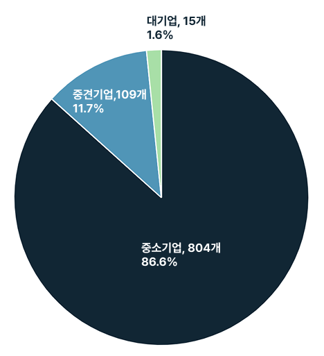 중·소기업 804개(86.6%), 중견기업 109개(11.7%), 대기업 15개(1.6%)