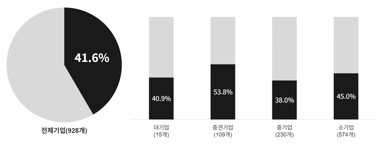 - 사업체 규모별로는 대기업의 경우 40.9%, 중견기업은 53.8%, 중기업은 38.0%, 소기업은 45.0%로 나타남